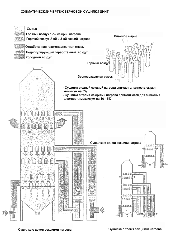 Одновременно аспиратором нагнетается горячий воздух для достаточного контакта с зерном и, таким образом, достигается основная цель - снижение влажности сырья. Сушилка модели SHNT имеет непрерывный принцип работы, влажное сырье подается из питающего бункера также непрерывно. Таким образом обеспечивается полная загрузка сушилки. Влага удаляется из сушилки посредством специальной системы отвода. Сырье после процессов сушки и охлаждения равномерно выгружается из сушилки выгрузным устройством для последующего его хранения. |