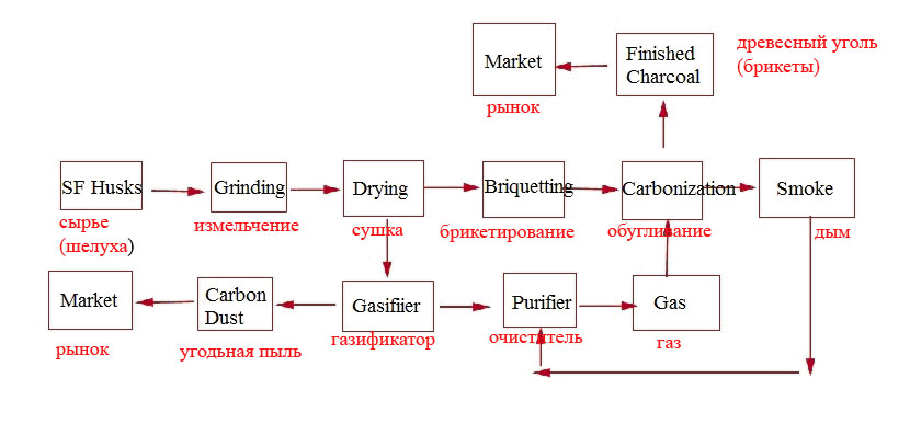 Другие параметры выходного продукта (например, из лузги подсолнечника): влажность – 3%, кол-во углерода – 65-70%, зольность – не более 5%, плотность – 0,9тонны/м3.