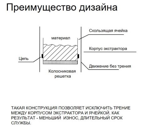 Состоит из двух горизонтально расположенных уровней: - верхней и нижней зон экстракции, по которым движутся (скользят, пояснение см. ниже) рамные ячейки (можно назвать их еще корзины) с экстрагируемым материалом. Основной рабочей частью данного экстратора является рамная ячейка, при этом для тяги здесь не используется перфорированный ленточный конвейер (как в ленточных экстракторах от известного европейского производителя). Вместо этого ячейки скользят по неподвижной колосниковой решетке, перемещая содержащийся в них экстрагируемый материал для последующего орошения его растворителем.