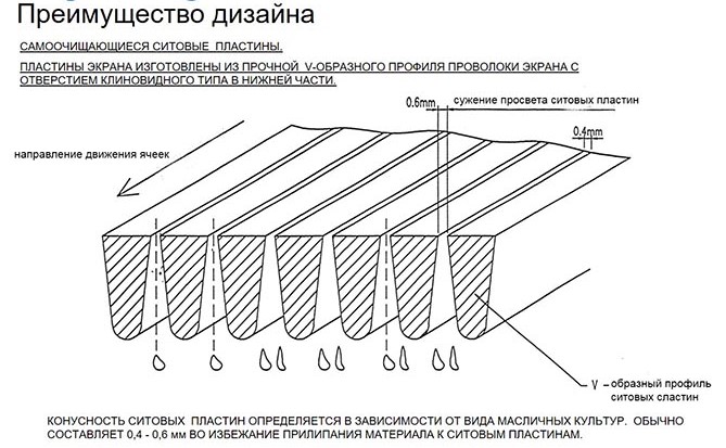 Нижняя часть колосниковой решетки как верхней так и нижней зоны экстракции разделена на верхний и нижний слои, собранные изряда V-образных проволочных решеток с шириной зазора от 0,4 до 1,2 мм (зависит от экстрагируемой масличной культуры. Через каждые 4–6 ячеек в нижней части колосниковой решетки имеется коллектор мисцеллы, а орошение материала растворителем осуществляют в общей сложности 6–8 циркуляционными насосами.