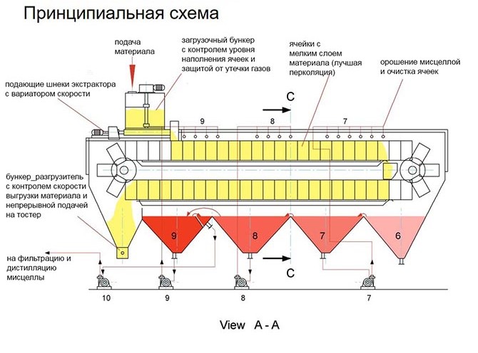 Когда ячейка верхнего уровня находится на середине своего рабочего цикла, находящийся в ней материал под действим силы тяжести выгружается в соответствующую ячейку, движущуюся на нижнем уровне.Освободившаяся от материала ячейка верхнего уровня переворачивается для последующего движения на нижнем уровне и, в свою очередь, готова принять выгружаемый материал от подошедшей ячейки верхнего уровня. Выщелачивание материала продолжается также в процессе движения ячеек на нижнем уровня до порта разгрузки;в результате ячейки освобождаются от обедненного на мисцеллу материала; затем опорожненные ячейки движутся на верхний уровень для приема новой порции материала. Цикл закончен, начинается новый и т.д.